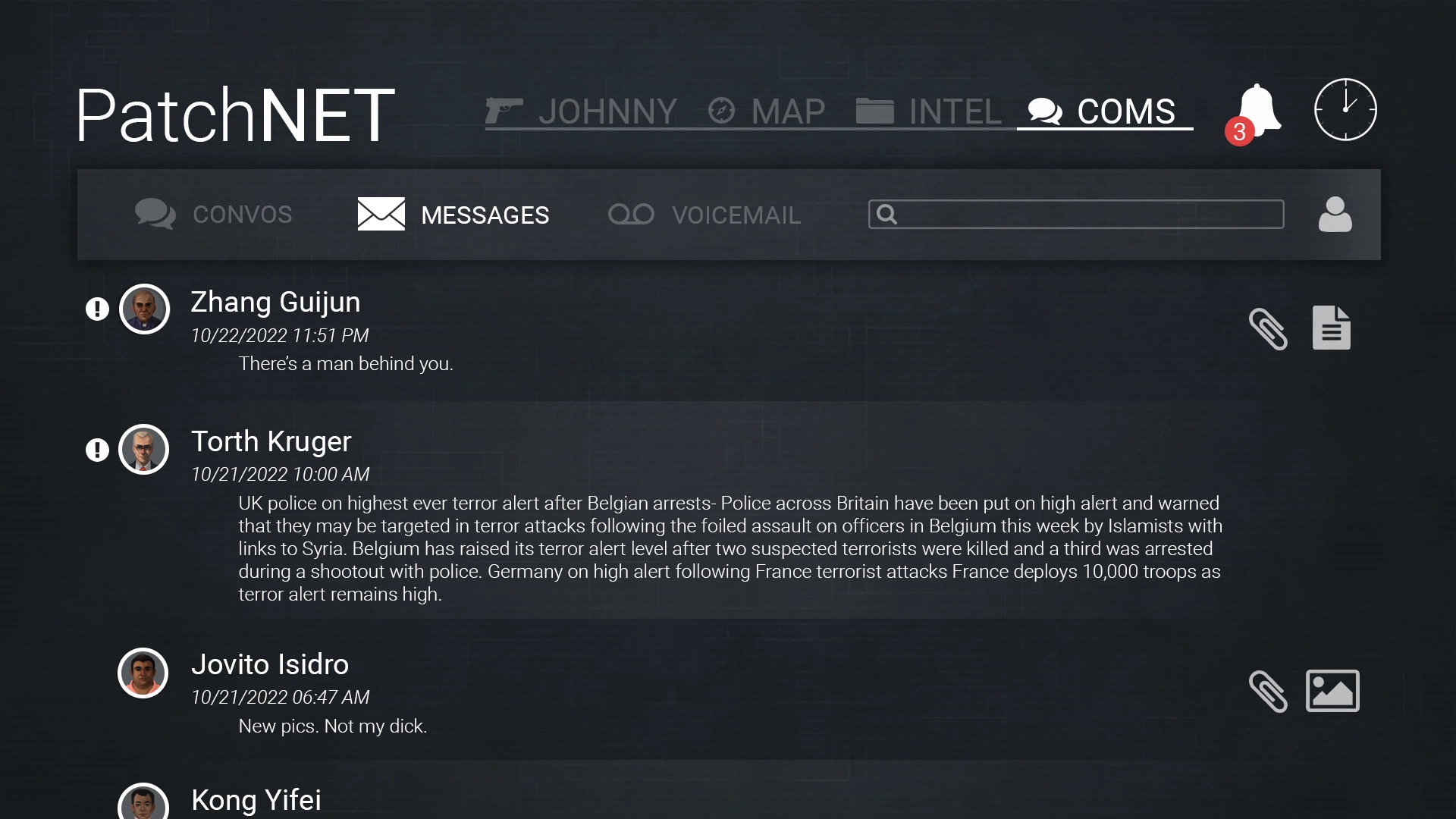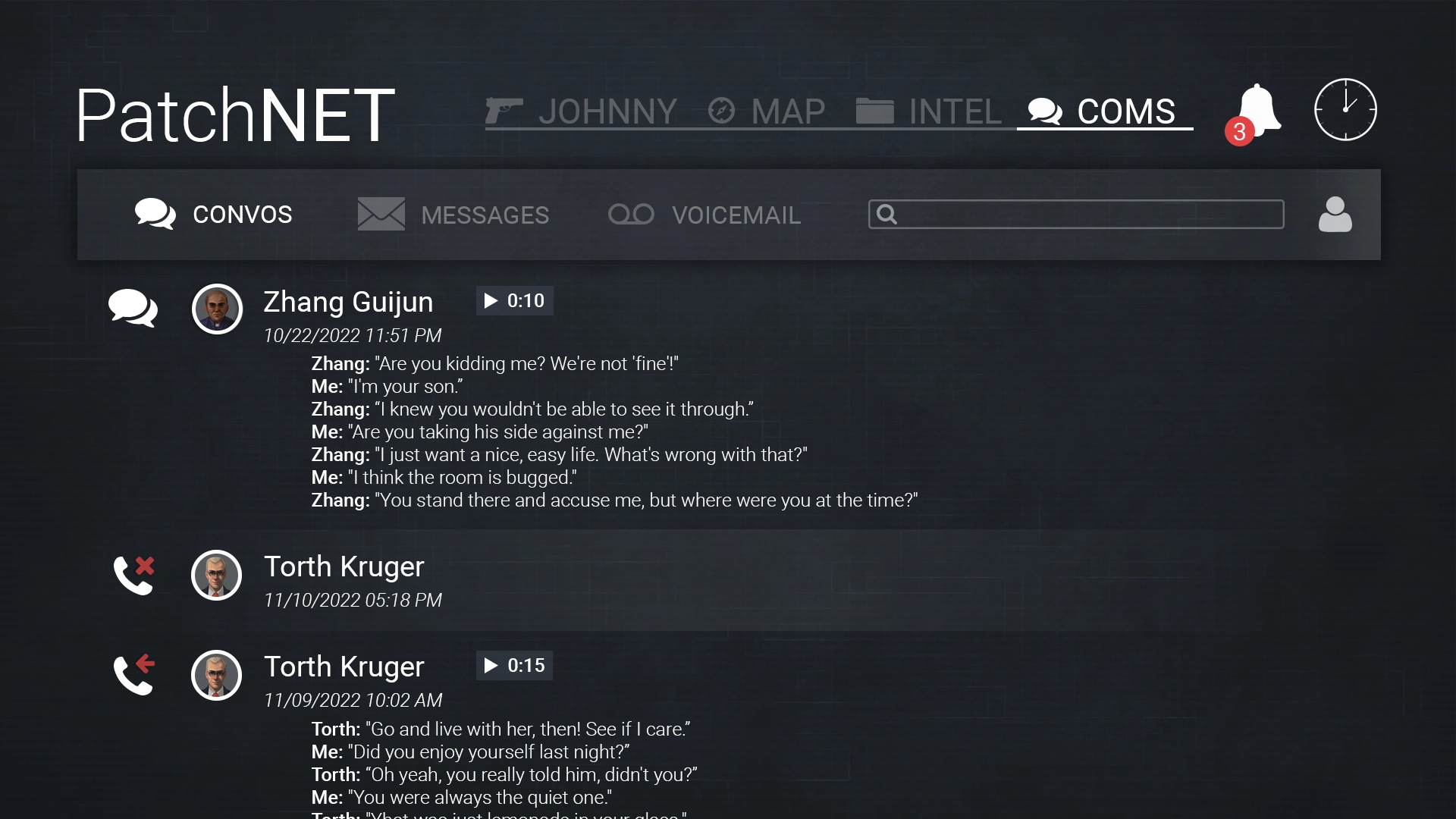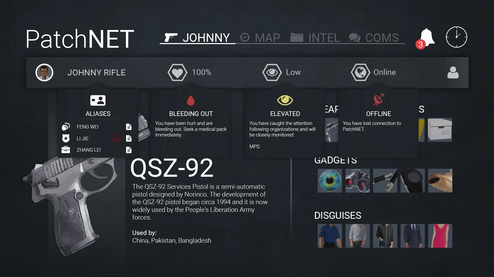 Because of the themes and subject matter, designing the game’s UI presented a challenge: it needed to communicate a large volume of information quickly, without overwhelming the player. Moreover, both the main menu and in-game menu had to visually explore the dark, and often complex, work of spycraft.